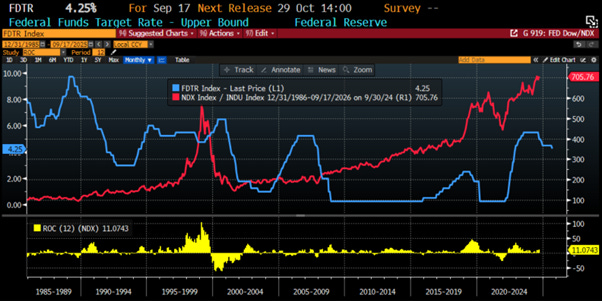 Sector patterns make it pretty clear: when the Fed starts cutting, it’s usually a win for the folks pumping oil, not the ones coding apps. Energy producers (hello, Dow Jones) tend to shine, while energy-hungry tech stocks (sorry, Nasdaq 100) start sweating. Translation: this rotation show has likely just begun, and Silicon Valley might want to carpool with Exxon for a while.