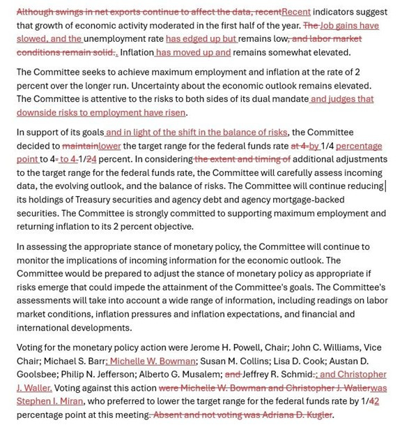 The FOMC statement read like a classic Fed compromise: a little something for everyone and a headache for anyone trying to make sense of it. They’re cutting rates, promising more cuts, talking up growth, and casually admitting inflation might run hotter — basically saying, “Yes, the economy’s on fire, so we’re lowering the price of matches.”