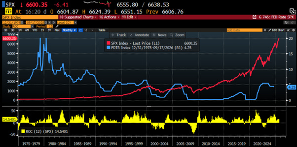 So, it’s hardly shocking that once the Fed pulls out the scissors and starts cutting rates, equity returns usually go from lively to muted — and before long, they often slide straight into the red. Think of it as Wall Street’s version of a hangover: the party ends the moment Jerome brings out the rate cuts.