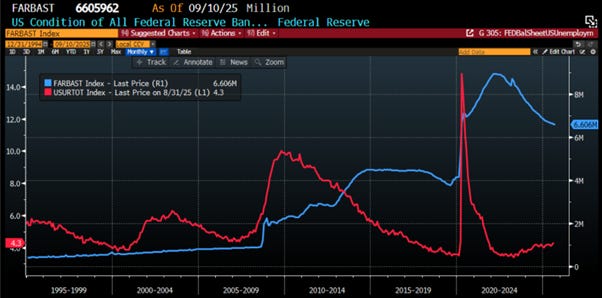 FED Balance Sheet (blue line); US Unemployment Rate (red line).