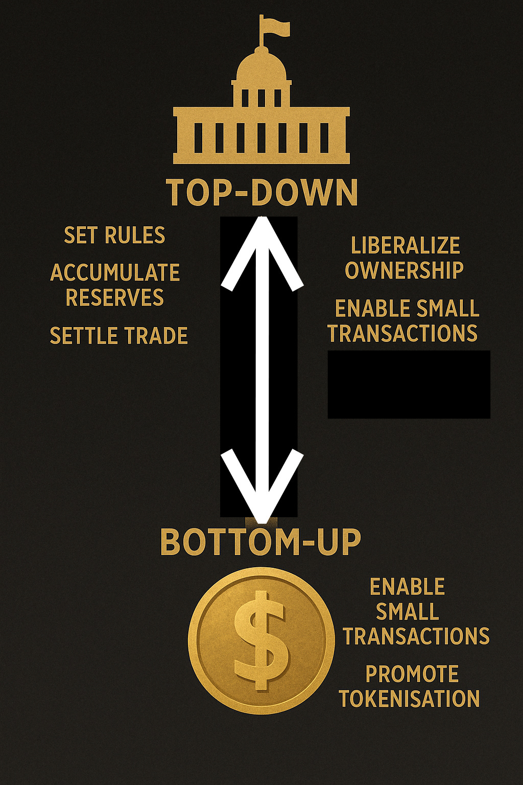 This mirrors the strategy being advanced by BRICS nations: a top-down and bottom-up rollout of gold as money. At the sovereign level, governments set rules, accumulate reserves, and choose to settle trade outside of dollars or treasuries. At the popular level, they liberalise ownership, enable small transactions, and promote tokenisation for seamless use. Taken together, these efforts create the conditions for gold to replace the dollar in transactions across BRICS economies.