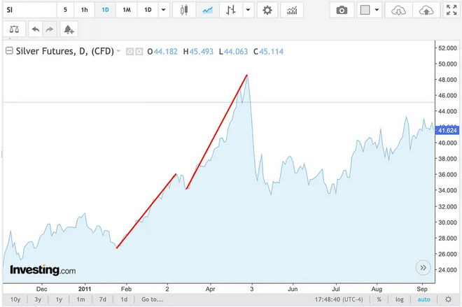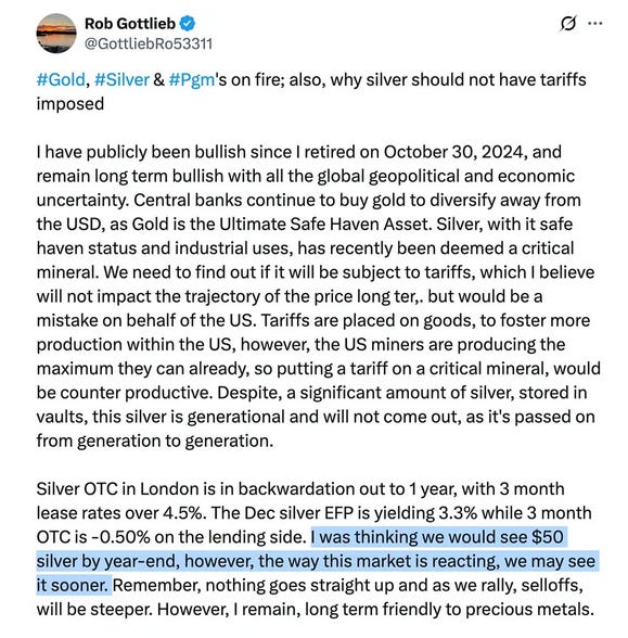 You also have rather well-known former J.P. Morgan precious metals managing director Robert Gottlieb saying that he was ‘thinking we would see $50 silver by year-end, however, the way this market is reacting, we may see it sooner.’