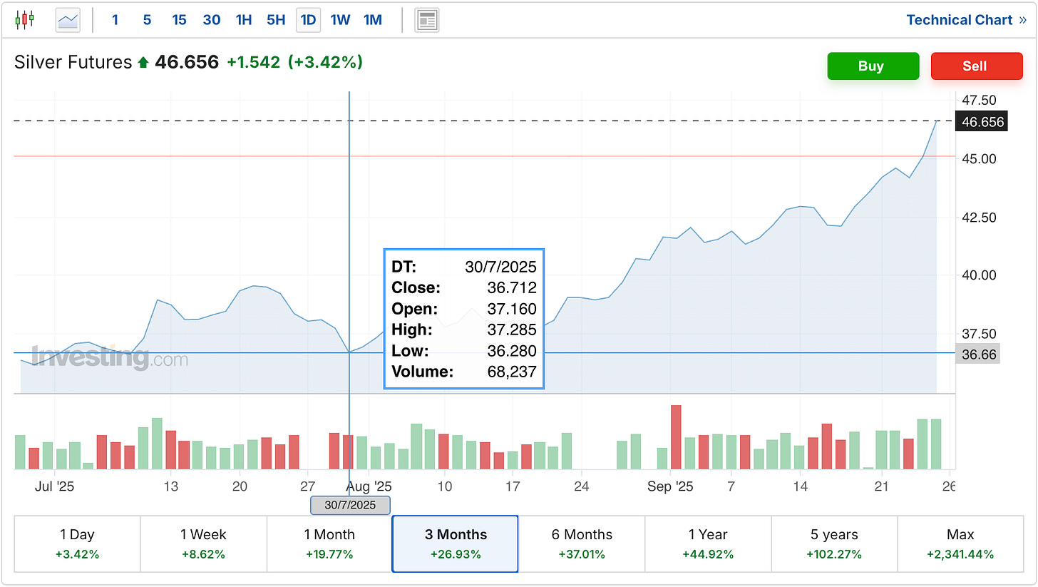In another stunning day in the precious metals markets, the silver price surged above the $46 level for only the third time in history as the futures rose $1.26 to $46.66.