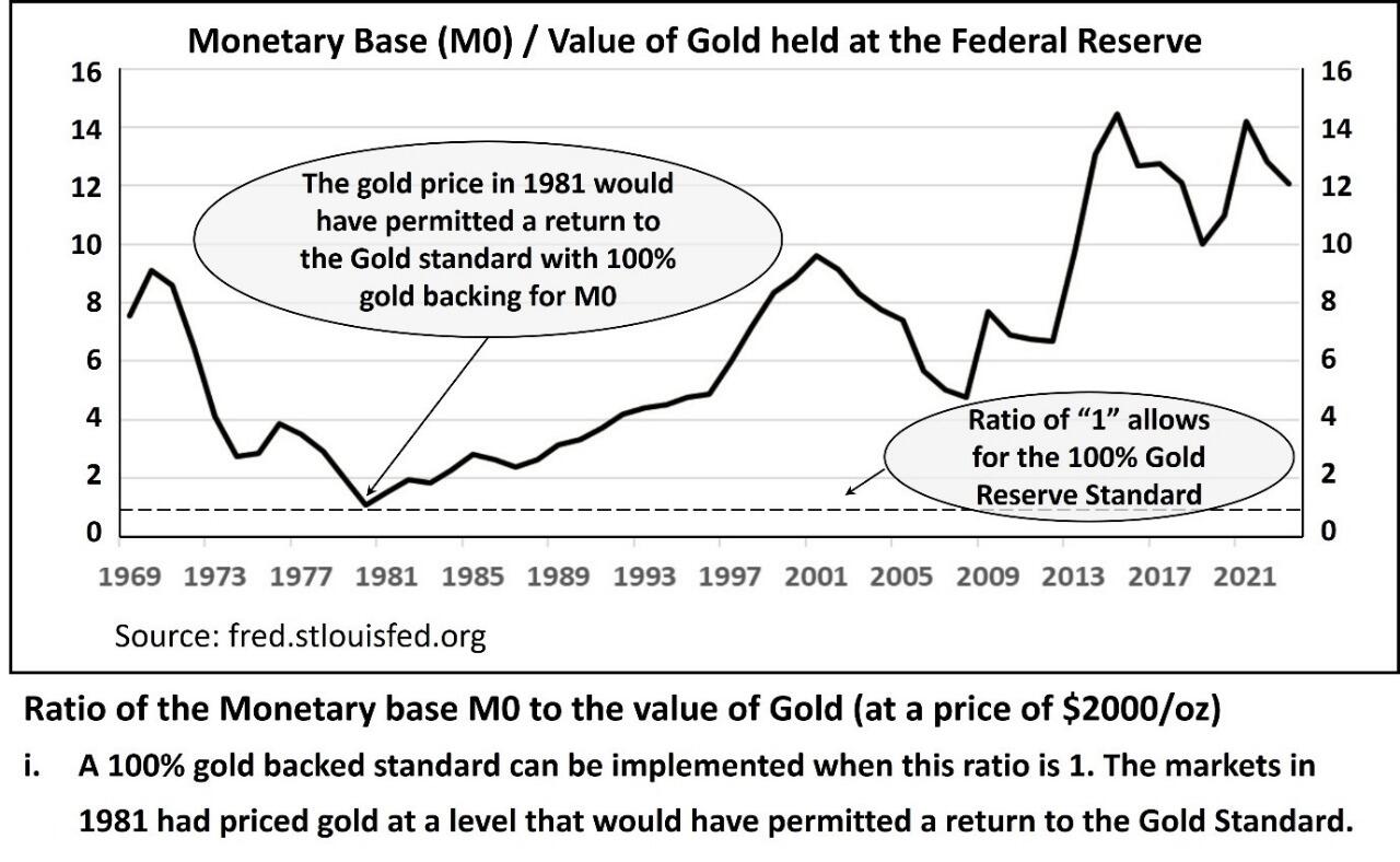 The book laid out the base case for gold prices hitting $24,000/oz by the end of the decade based on a return to “some form” of the Gold Standard by the US Fed. The $24,000/oz number was based on a 100% backing for the M0 component of the then (Q1 2024) Money Supply and is shown below. The graph (reproduced from the book) indicates that at twelve times the then price of $2000/oz, the Fed could have backed the base money (or “M0” component of the Money Supply) with its existing gold reserves.