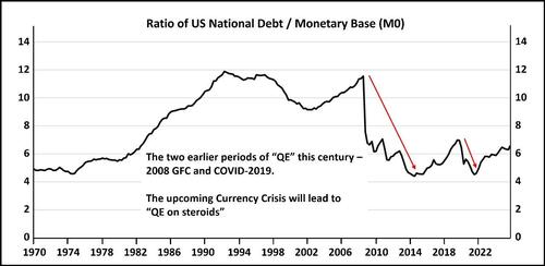 The graph above indicates the external leverage that the US Government was able to get through the US Federal Reserve, financing a portion of the National debt. At its peak, between 1990 and 2007, for every $1 of the Monetary Base, the US Government was able to sell (or more correctly, borrow) up to 12 times in international markets. When the Fed monetizes the deficit, it does so by buying Treasury securities (typically long-dated) by creating new currency, which increases the Monetary base. When there is a massive expansion of the deficits, a significantly large portion of the US National Debt must be financed by the US Federal Reserve, which increases the monetary base. This causes the ratio to decline, as we witnessed during the 2008 GFC as well as during the COVID-19 pandemic. From these lows, the ratio has increased to 6+ as indeed it has today.