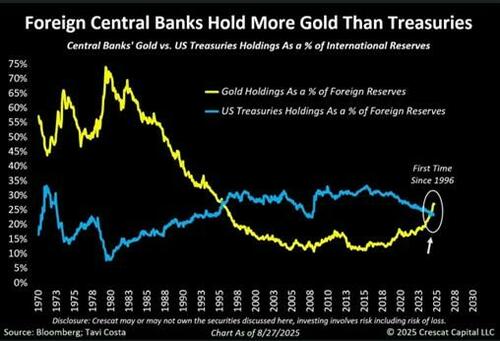 Although it is still far from the 75% it should be at, an important milestone was achieved earlier this year. For the first time this century, the value of gold held by the central banks surpassed the holdings of US treasuries. The US has not exactly endeared itself to the other countries by its outrageous foreign policy, tariff tantrums, and, not to mention, the ballooning trade deficits.