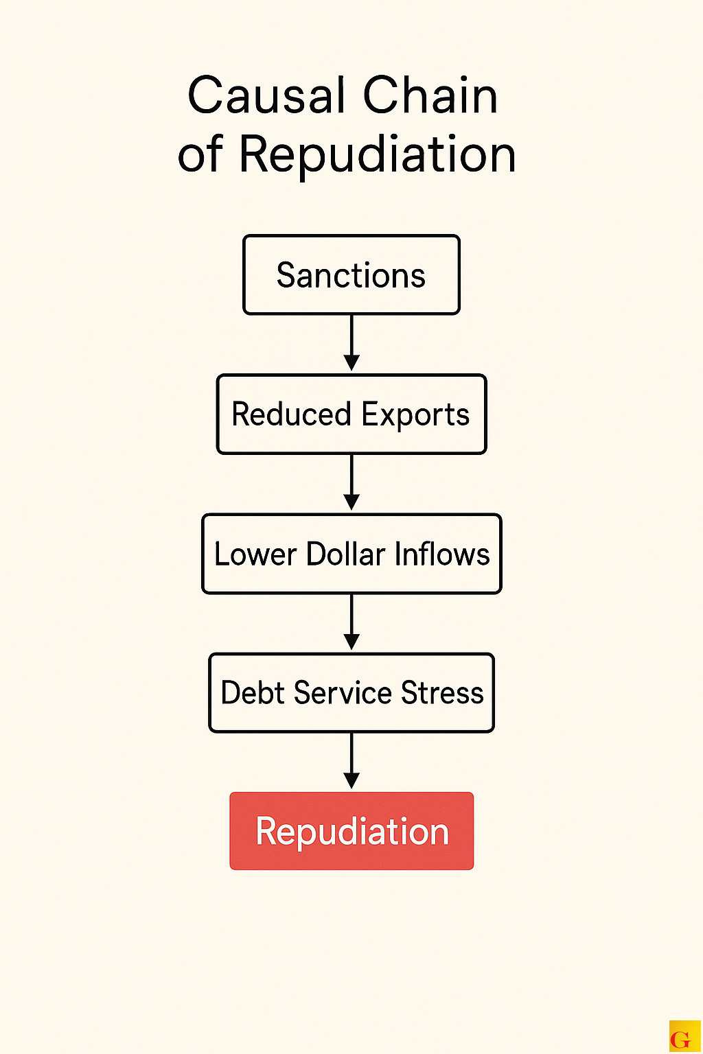 When those flows are artificially constrained by U.S. policy, a debtor nation’s financial stress becomes externally imposed rather than self-inflicted. This lays the foundation for an argument of repudiation or suspension of payments under the doctrines of odious debt or force majeure in a sovereign context. There is precedent for such reasoning, although legal theory and political reality are often miles apart.