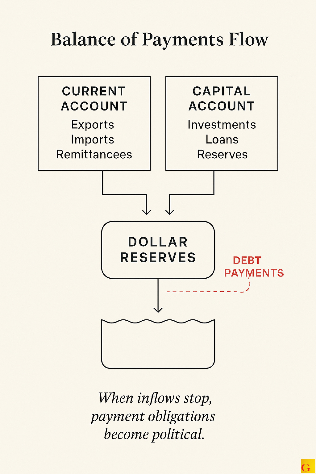 The balance of payments is the accounting framework that tracks all monetary transactions between a nation and the rest of the world. It includes the current account (exports, imports, and income flows) and the capital and financial accounts (investment and lending). For a country with dollar-denominated debt, maintaining balance means earning sufficient dollars from trade and investment inflows to cover obligations.