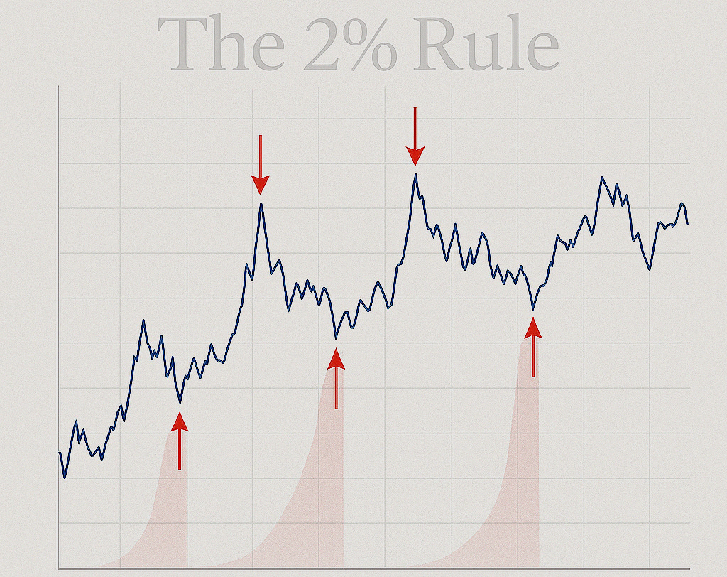 The first is the speed rule. Historically, whenever gold climbed more than twenty dollars in a day, the rally ended almost immediately. As the market matured and volatility increased, that evolved into a two-percent rule: any daily rise above two percent typically led to a decline of two to four percent within the following two weeks.