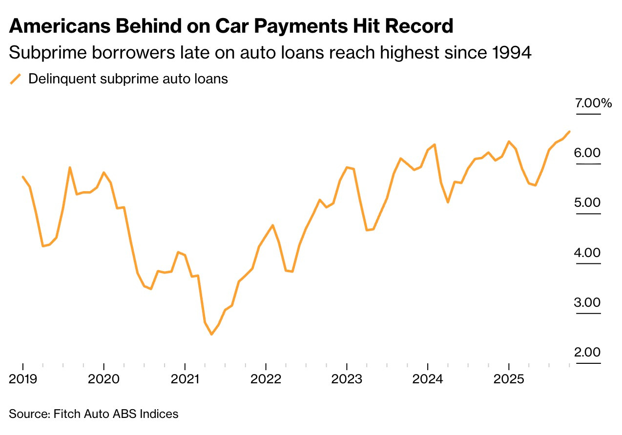 The fallout is already visible, as I’ve written about: subprime lender Tricolor Holdings filed for bankruptcy in September, underscoring the risks facing both borrowers and lenders.