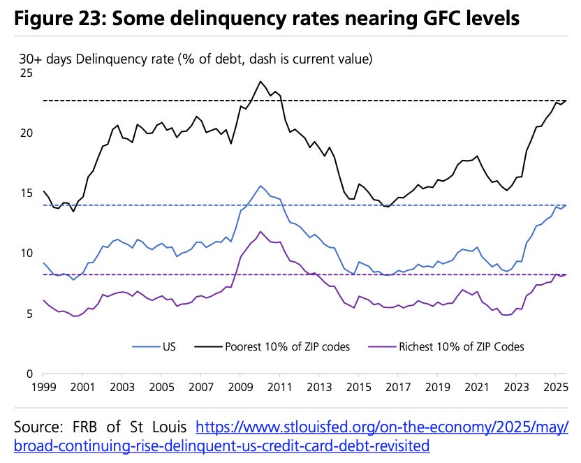Thirdly, uneven US economic data. Job growth is stalling, and indicators tied to lower-income households (e.g. consumer confidence and credit delinquencies) have softened. Chart below is delinquencies by cohort; lowest incomes (black line) is near 2008-highs, while high earners (purple line) is only modest. These trends are raising concerns about the durability of economic growth heading into 2026.