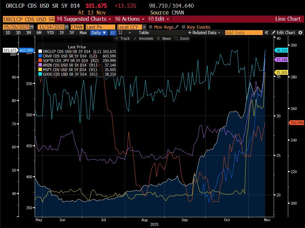 Then, last week, I pointed out that CoreWeave’s 5 year credit default swaps had quietly begun to blow out. What had been a 250–300 bps name earlier in the year ballooned to around 360 bps in early October, then to roughly 510 bps—meaning investors suddenly demanded over a five percent annual premium just to insure against a default within five years. For a recently IPO’d company propped up by its own supplier, that was an unmistakable sign of rising fear.