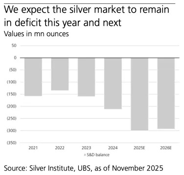 Despite incremental supply growth, UBS expects the physical market to remain in structural deficit. The 2025 shortfall is estimated near 300 million ounces, narrowing only modestly to approximately 293 million ounces in 2026, a deficit profile that continues to underscore the tightness of the global silver balance.