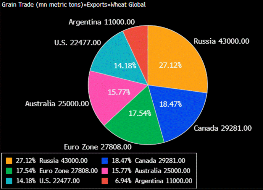 In the global wheat export arena, Russia is currently playing king of the grain hill, projecting a record 53 million tons for the current marketing year—enough to claim a 26% share of the world market. That’s the highest market share in Russia’s history, proving that when it comes to wheat, Mother Nature and the Black Sea are very good allies. Hot on its heels are Australia and Canada, duking it out for second and third place, proving that even in the wheat world, there’s always room for a polite rivalry… and maybe a little bragging at the annual grain conference.
