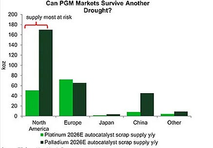On the supply side, TD disputes prevailing scrap-boom expectations. Rather than rapid secondary-supply growth, TD expects scrap recovery to remain delayed until at least 2027. Regional scrap flows from North America are projected to remain broadly unchanged, diverging from consensus estimates for sizeable increases in platinum and palladium recycling volumes. Combined with structural underinvestment in mine supply, this outlook supports persistent market deficits extending into the later years of the decade.