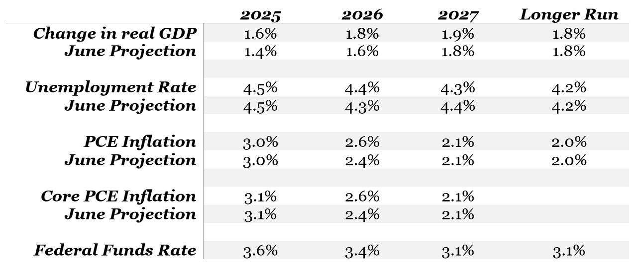 But the cut itself isn’t the story. It’s already priced in. What matters most is the Fed’s outlook on monetary policy moving forward. As you can see from the table above, Wall Street expects the fed funds target range to drop by a total of 50 basis points to a range of 3% to 3.25% by September 2026.