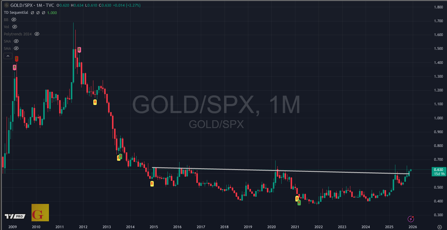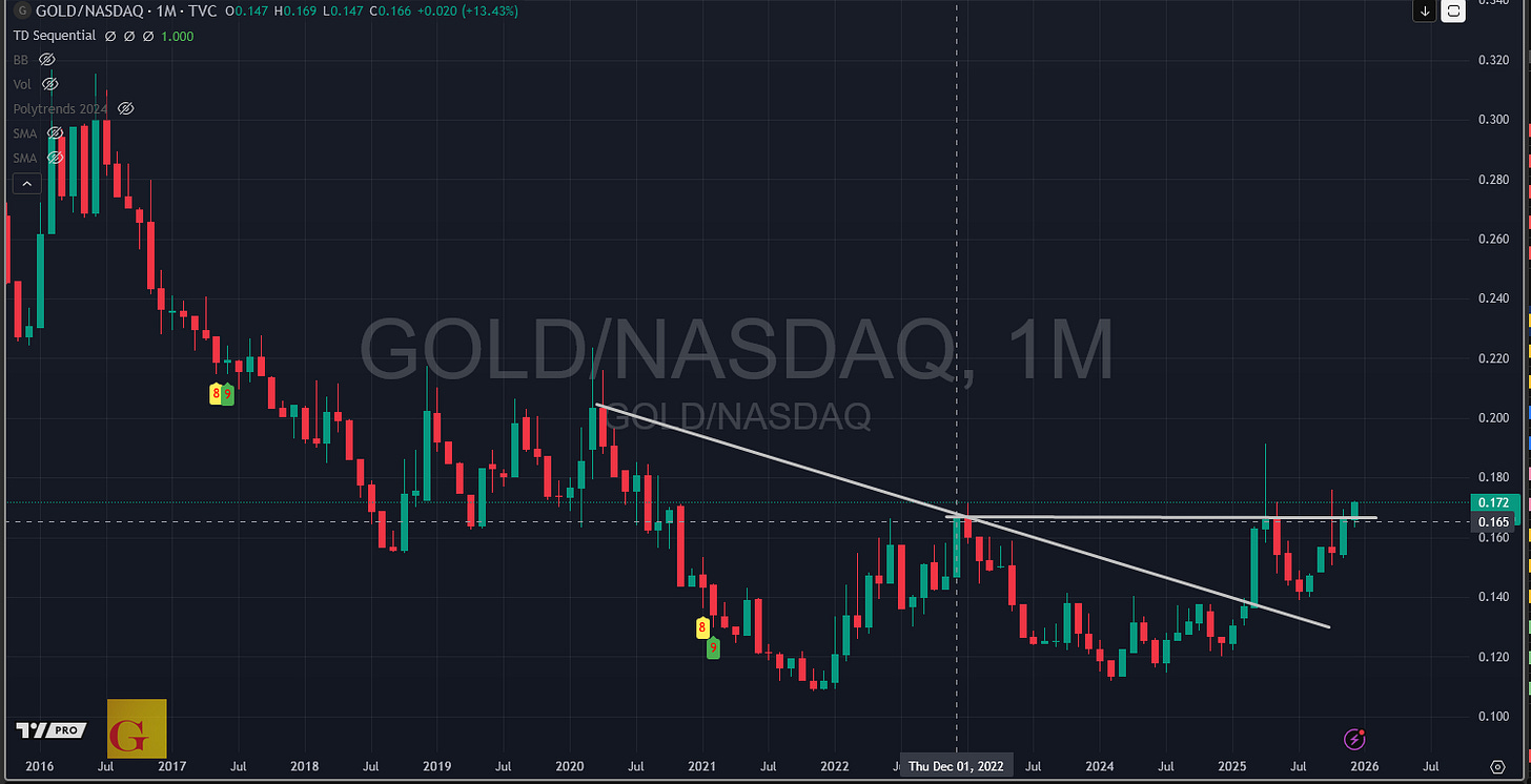 Gold vs. NASDAQ 100 monthly relative-performance spread (2013–2025), showing clearance of long-term resistance...