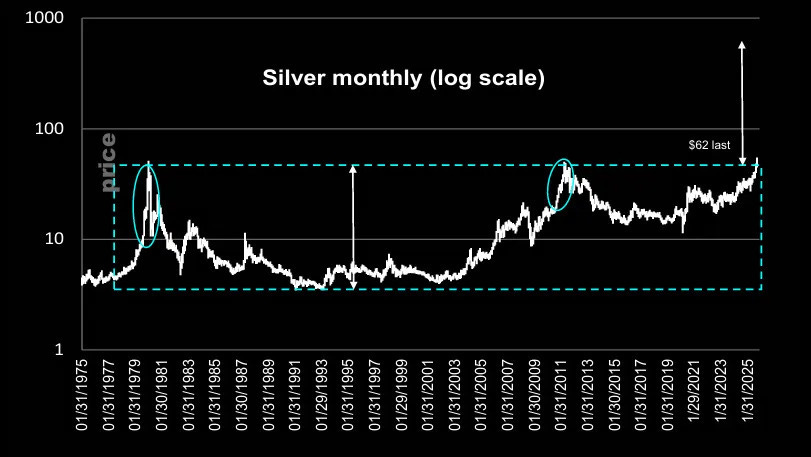 Silver is assessed primarily through its relative performance against gold. The report highlights two historical episodes, late 1979 to early 1980 and 2010 to 2011, in which silver’s explosive advances were preceded by decisive silver-to-gold spread breakouts.