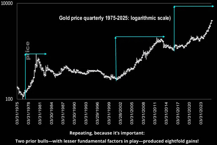 The analyst situates the current gold advance within a multi-decade framework, noting that prior secular bull markets, despite weaker supporting fundamentals, produced gains on the order of eightfold from bear-market lows. By comparison, the present cycle remains smaller in proportional terms.