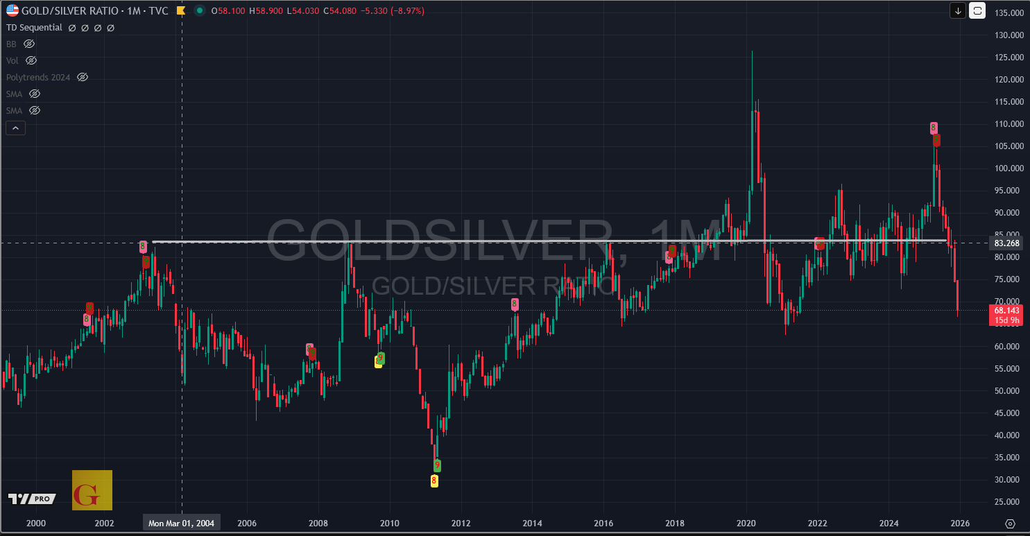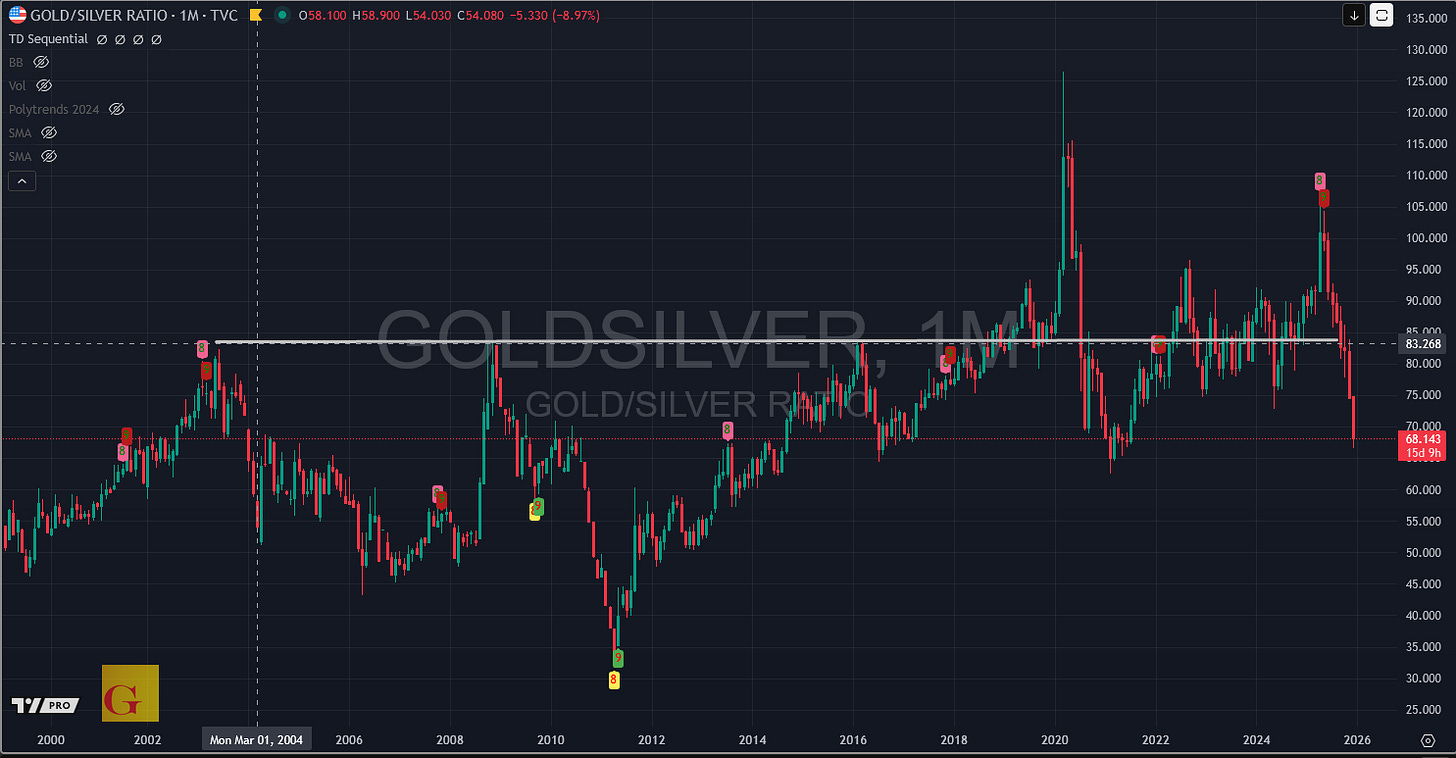 At the November close, silver broke out of a multi-year relative-performance base versus gold. According to the analysis, this event signals the onset of a major rediscovery phase. Prior analogs produced price moves ranging from more than a doubling to several multiples over compressed timeframes.