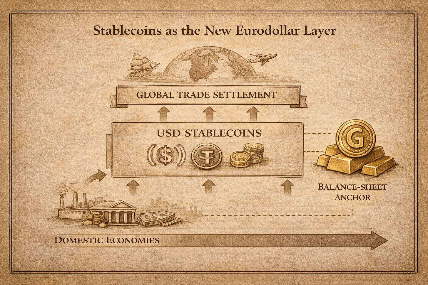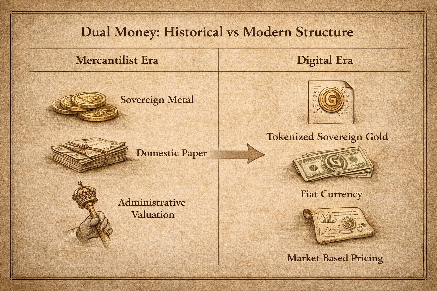 Historically, monetary systems operated in layers. Sovereign money and domestic money existed simultaneously, each serving a different function. Gold and silver anchored external obligations and inter-sovereign settlement. Domestic currencies circulated internally and adjusted to political and economic needs.