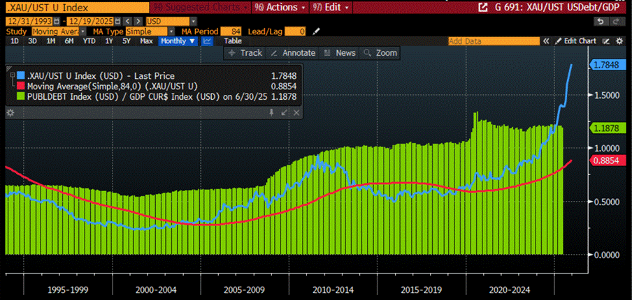 If you strip the bond market of its suits and slogans and look at it in real terms—gold versus U.S. Treasuries, seasoned with a dash of debt-to-GDP—the pattern becomes almost embarrassingly obvious. From 1995 to 2003, when Washington briefly practiced fiscal restraint, gold sulked, underperformed Treasuries, and stayed obediently below its 7-year moving average—deflation dressed as discipline. From 2003 to 2013, the debt binge resumed, the ratio exploded, and gold promptly woke up and outperformed, sensing inflation long before it was fashionable. Then came 2013 to 2019, another flirtation with restraint, another deflationary lull, and gold politely stepped aside—until the Covid “plandemic” spending spree blew the debt ratio into orbit and sent gold into parabolic outperformance against Treasuries. In short, betting that bonds will preserve wealth better than gold from here assumes the U.S. will rediscover debt orthodoxy—an event about as likely as Sunday refusing to hand the baton to Monday, especially while empire, deficits, and forever wars remain firmly on the agenda.