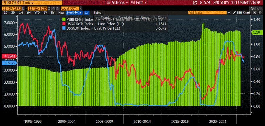 US Pubic Debt as a % of GDP (green histogram); US 3-Month Yield (blue line); US 10-Year Yield (red line).