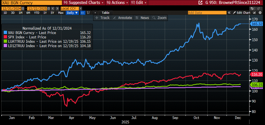 Nominal (not ‘CP-Lie’ adjusted) performance of $100 invested in physical gold (blue line); S&P 500 index (red line); Bloomberg US Treasury Index (green line); Bloomberg US Treasury Bill: 1-3 Months Index (purple line) since 31/12/2024