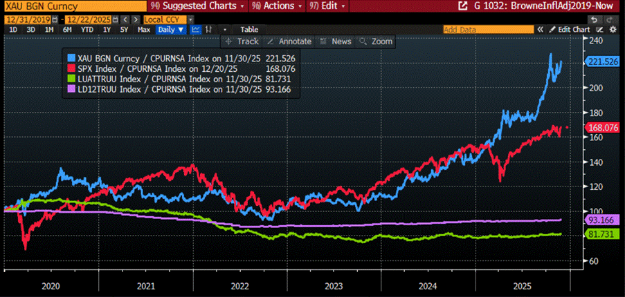 Since the Covid plandemic and wars scrambled supply chains, rewired supply and demand—the only things that actually cause inflation—and finished off what little trust remained in public institutions, inflation has been quietly chewing through investors’ nominal returns, even as measured by the generous CPI fairy tale. And the numbers are an excellent cure for bond-related bedtime stories. Over the past five years, a heroic $100 invested in U.S. cash shrank to $92.3 in real terms, while bonds performed an even finer disappearing act, leaving just $80.6. Meanwhile, the supposedly “risky” assets failed to get the memo: the same $100 became $201.2 in gold and $163.8 in the S&P 500, CPI-adjusted. For anyone still believing that bonds and cash preserve wealth, this is not a market signal—it’s an intervention.