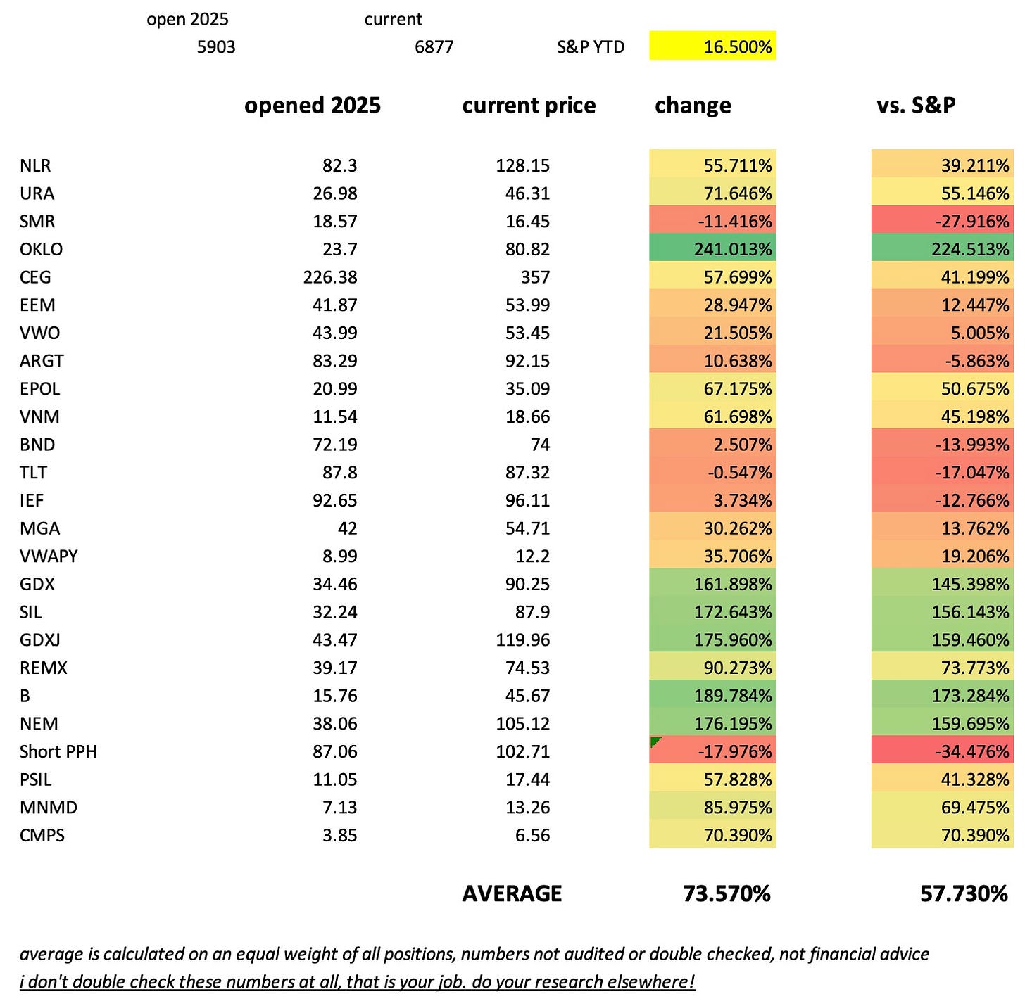 Last year made one thing painfully clear: most market commentary is just people narrating price action after the fact. While the crowd obsessed over bullshit “analysis” on crypto, bowing at the altar of modern monetary theory and every type of cash burning turd of company one could find, the blog’s 2025 portfolio focused on where capital was actually moving, where supply was constrained, and where the setup was asymmetric. While in past years I’ve lagged the S&P, this year my approach didn’t just work — it embarrassed the benchmark. Can I continue in 2026? Who the hell knows.