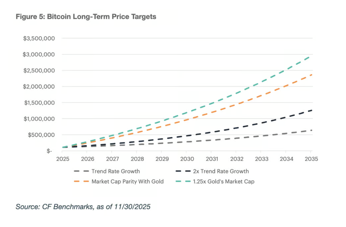 CF Benchmarks models several scenarios using gold as a benchmark. In their base case, bitcoin reaches roughly 33% of gold's market capitalization by 2035, implying a bitcoin price of approximately $1.4 million per coin. Their bear case assumes bitcoin continues growing at its historical trend rate, reaching 16% and a price around $637,000. In the bull scenario, bitcoin achieves parity with or exceeds gold entirely, reaching $2.4-3.0 million per coin.
