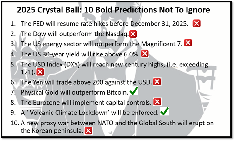 Because humility is the foundation of all investors, a review of The Macro Butler’s bold predictions for 2025 invites restraint rather than triumph. Many did not fully materialize during the Jubilee Year, though it remains likely that several may unfold in time. In markets, as in life, timing is often the teacher: outcomes delayed are not always outcomes denied, and patience remains as important as conviction.