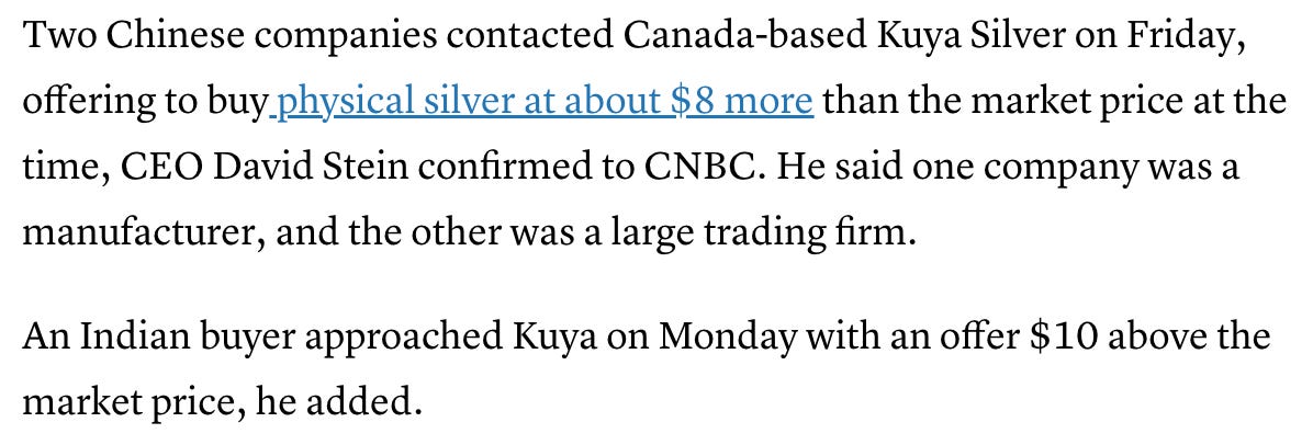 Last Sunday, David Stein of Kuya Silver joined me on our YouTube channel and talked about how when the silver spread between New York and China blew out last Friday, he was approached by two separate groups from China that wanted to buy his company’s silver production at an $8-$10 premium. Then on Monday, he was contacted by a group in India that wanted to do the same.