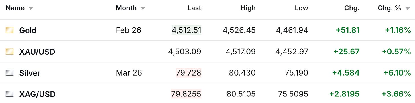 The gold and silver prices are up on another volatile Friday, with silver even trading back over $80 per ounce earlier in the session.