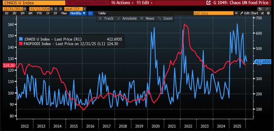 US Chaos Index (blue line); UN Food & Agriculture Food Prices Index (red line)