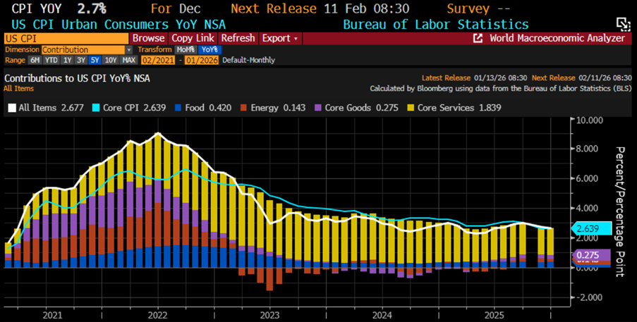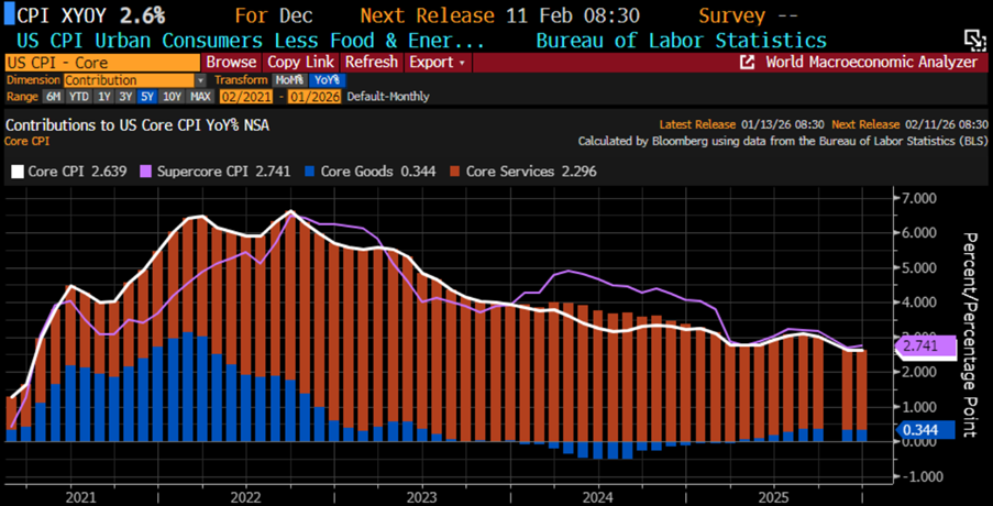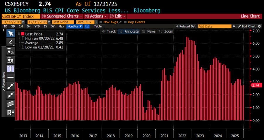 Core CPI in December tiptoed in at +0.2% MoM, a polite step below the +0.3% forecast. Year over year, it printed +2.6%, also a hair under the +2.7% consensus and perfectly aligned with November’s “see, it’s cooling” +2.6%. Meanwhile, core services—the heavyweight champion, accounting for a hefty 76% of the inflation buffet—finally put down the fork, easing to +2.29% YoY, its chilliest annual reading since September 2021. Even the biggest guest at the table seems to be pretending the party is winding down.