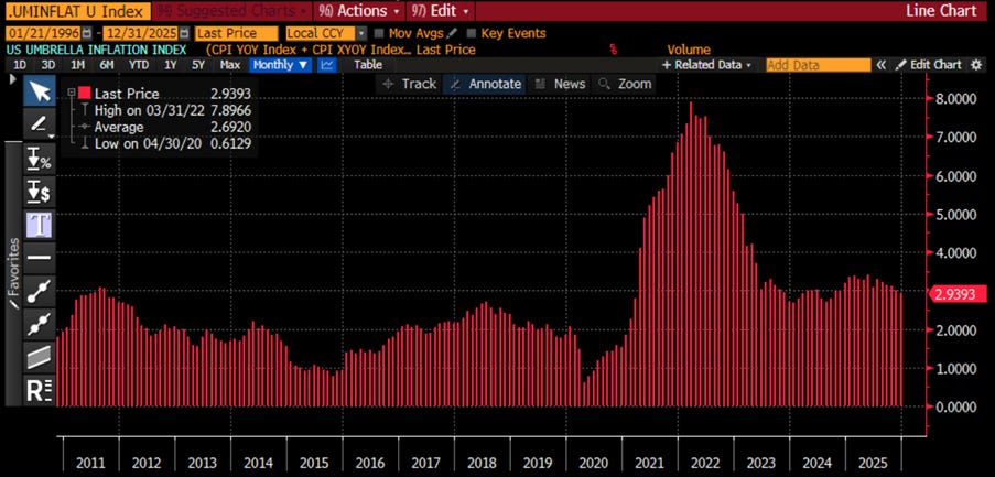US Umbrella inflation Index (Average of CPI; Core CPI; PPI; Core PPI; Core PCE, 1-year consumer inflation expectations)