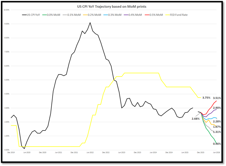 At more realistic 0.3%+ prints, we’re cruising toward 2.3%–3.5% CPI by mid-2026.