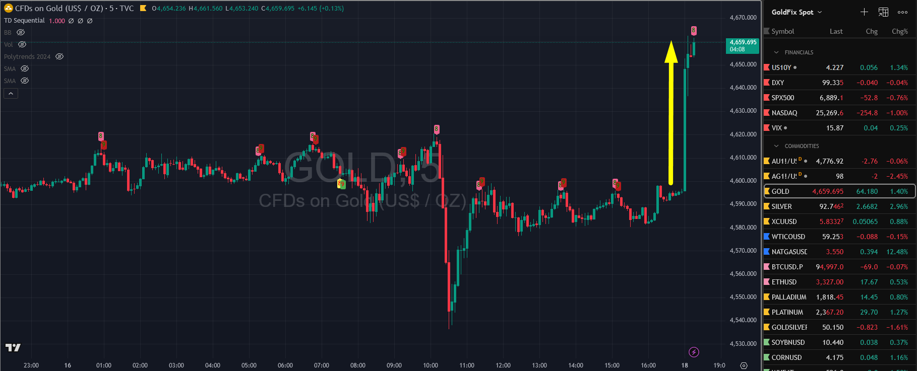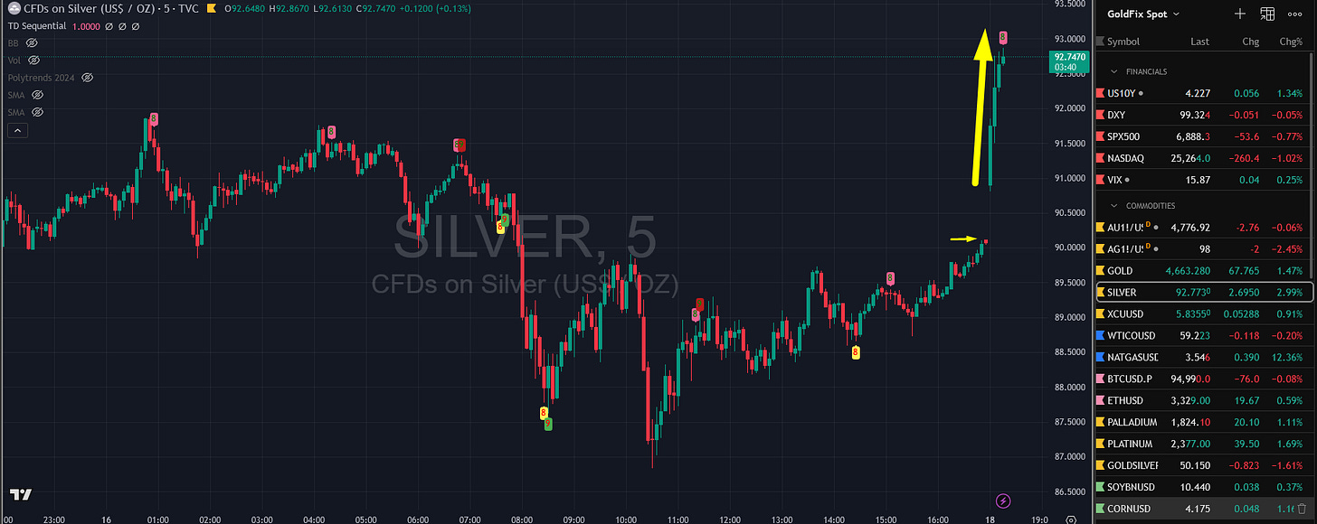 Markets reopened at 6 p.m. Gold came out of the gate flat, then surged nearly $60. Silver gapped higher and has not looked back. Platinum also opened higher. Even copper is up about one percent.