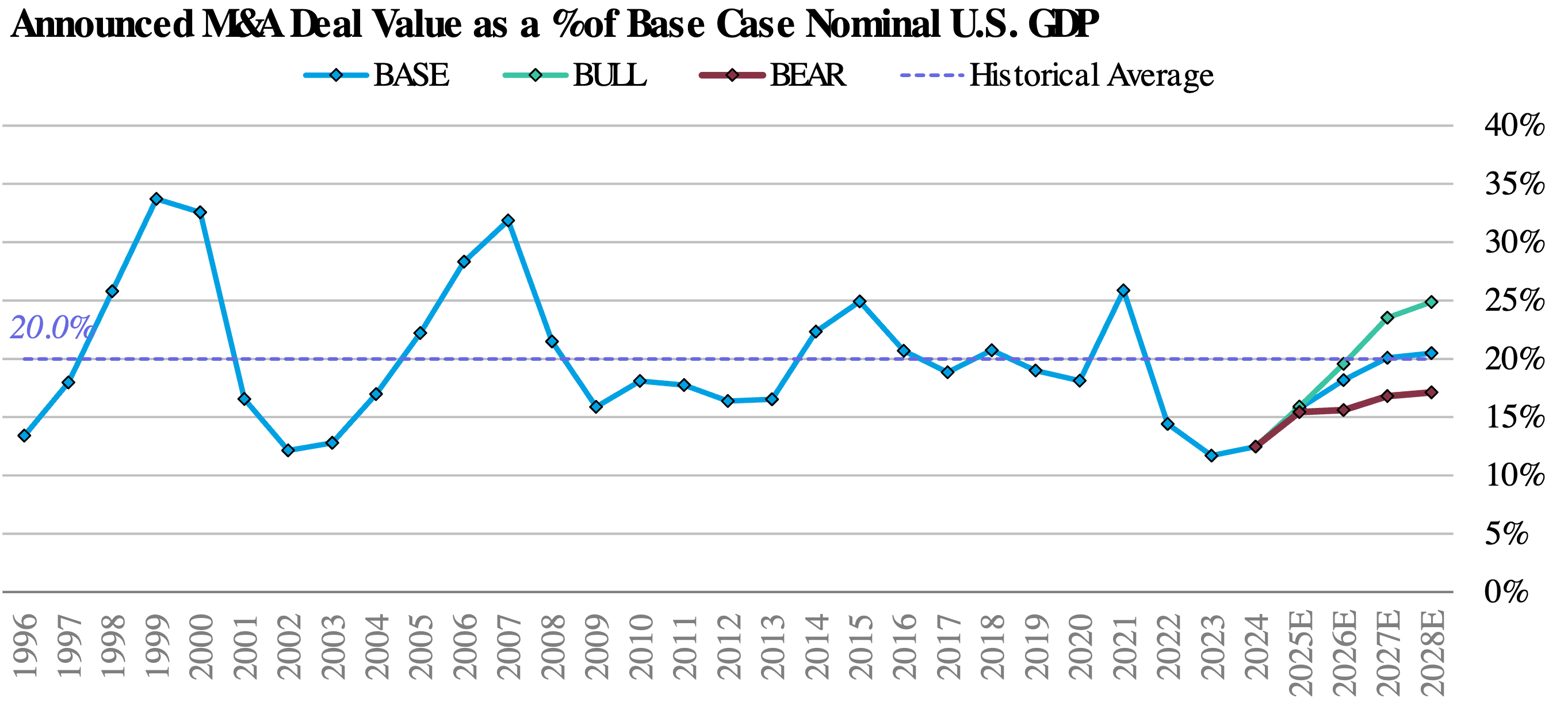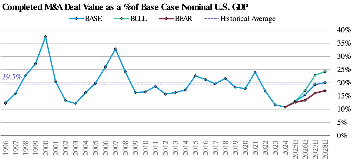 Markets are due for an inflection following three years of below-trend M&A volumes relative to nominal GDP. Company management teams are incentivized to grow their business, and opportunistic inorganic levers are common mechanics toward these objectives. Theoretically, managements should have used the last three year window to set up growth strategies with pre-identified prospects and preliminary conversations to accelerate deal announcements and completions in an upturned market.