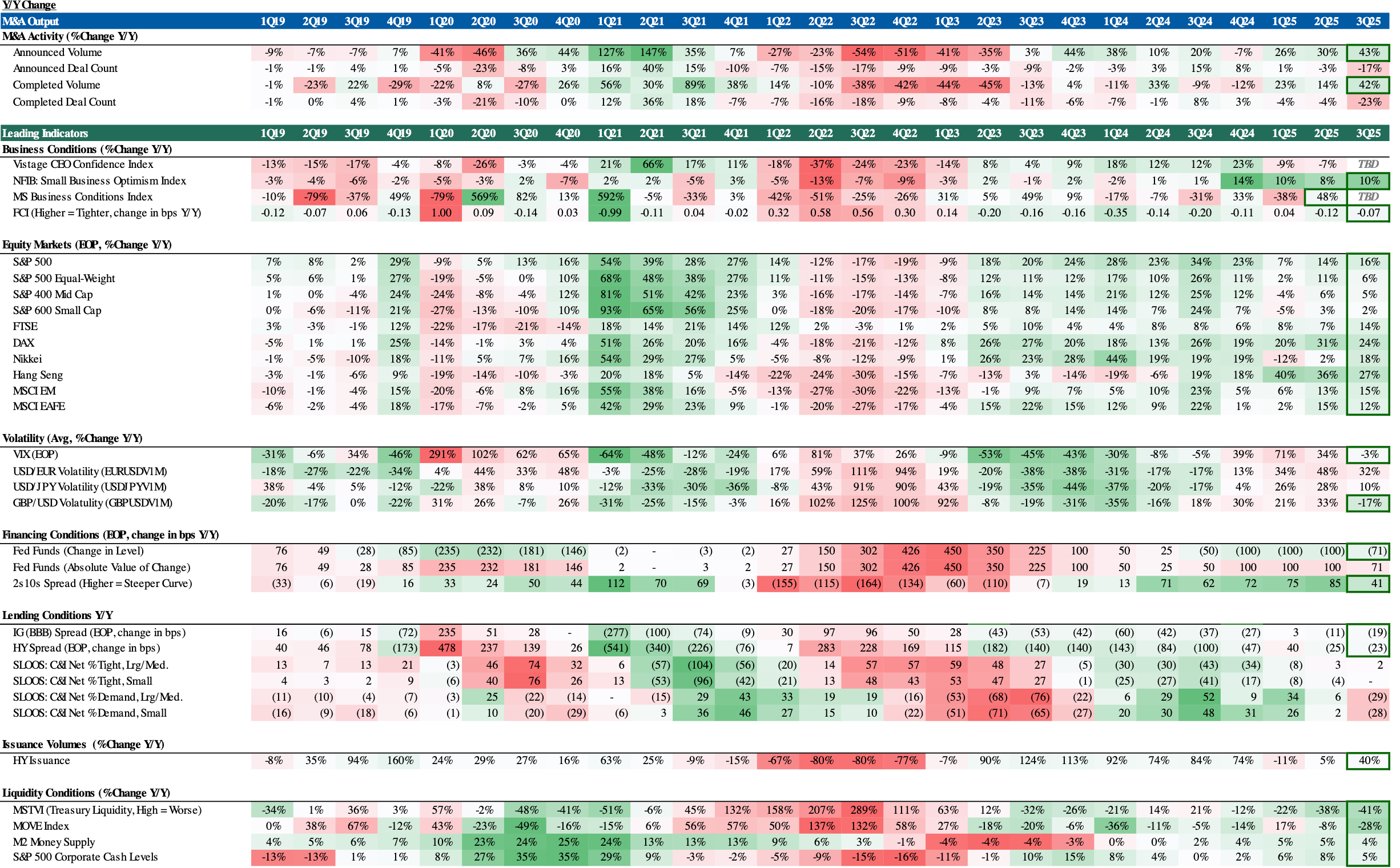 As of 3Q25, MS updated their heat map framework of leading indicators for M&A activity. It shows the majority of indicators improving YoY for the past several quarters, with global M&A announcements building YoY for three consecutive quarters. Important highlights include:
