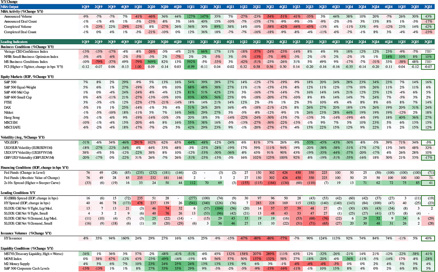 Source: Dealogic, Vistage, FactSet, Bloomberg, Federal Reserve Senior Loan Officer Survey, Morgan Stanley Research; Note: M2 data as of August 2025.