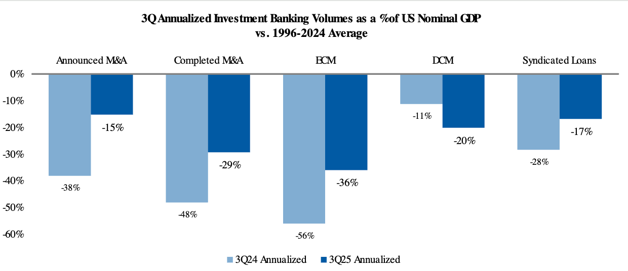 3Q25 annualized investment banking volumes relative to nominal GDP are still 15% below average for announced M&A and 29% below average for completed M&A, even after a significant improvement versus 3Q24: