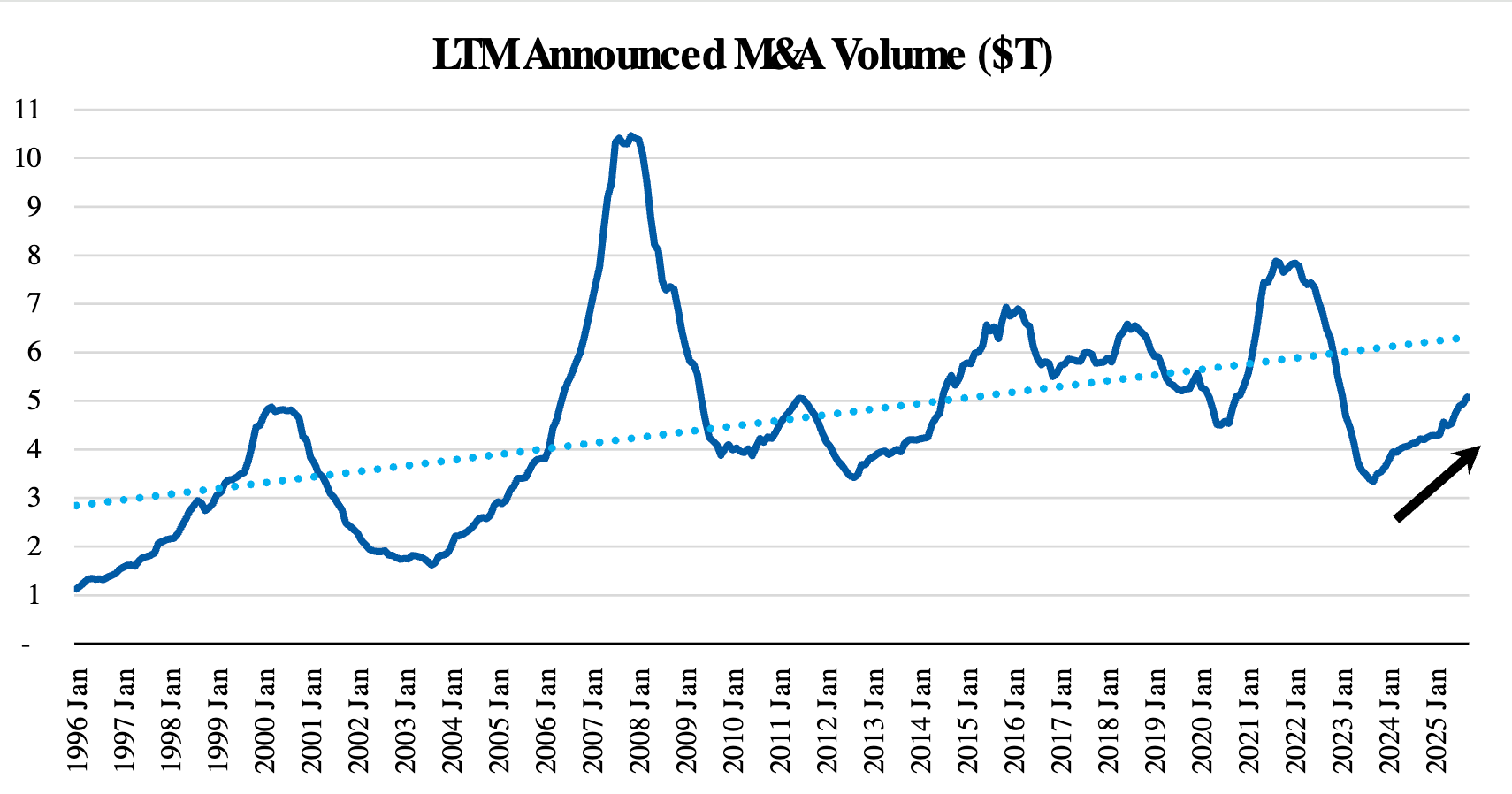 The global M&A market has transitioned from an executed 30-year low in 2023 to a period of sustained recovery. Following a 43% year-over-year increase in announced volumes in 3Q25, a multi-year rebound is anticipated. This trend is supported by robust equity markets, greater corporate confidence, lower interest rates, growing pressure on private asset managers to deploy, and a more predictable regulatory environment.