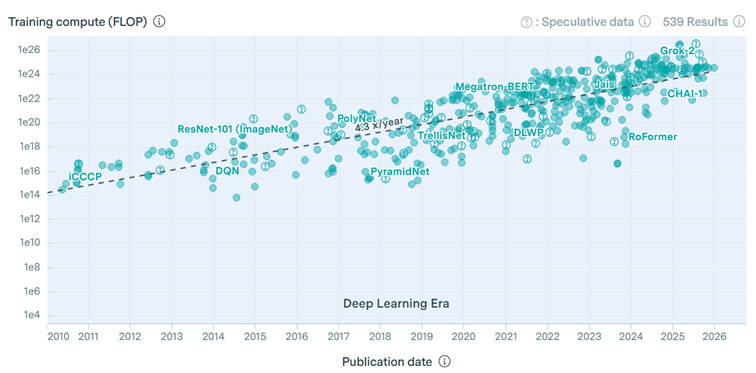 The following EpochAI chart points to a ~4.3x annual increase in computational power used to train LLMs
