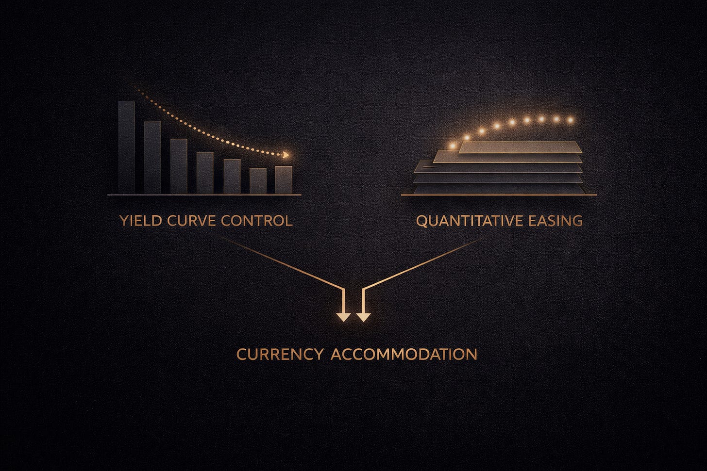 Yield curve control and quantitative easing differ operationally, yet they converge in function. Both suppress long-term funding costs. Both expand balance sheets. Both weaken the currency. The implementation details matter to technicians; the macro consequence matters to holders of purchasing power and to anyone tracking reserve behavior.