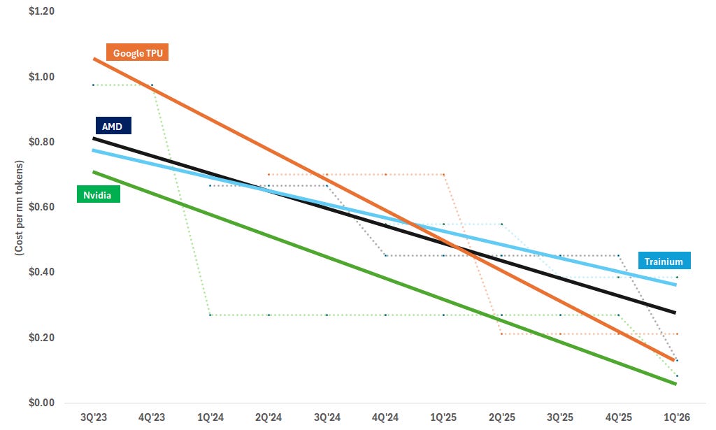 Cost reductions are less steep for AMD and Amazon, although we expect AMD’s MI455X rack and Trainium 3/4 to potentially be more competitive with Nvidia and Google. Based on our analysis - which is primarily driven by raw compute performance - we believe that AMD and Amazon currently lag behind Nvidia and Google TPUs in terms of both generation-to-generation cost reductions and absolute inference cost. Although these solutions can be further optimized for certain workloads, we view the threat to Nvidia from current AMD and Amazon solutions as relatively low at this stage. On this front, we believe AMD’s rack-level solutions could be more cost competitive, with AMD claiming that its rack-level solution will be on par with Nvidia’s VR200 for training and inference. Since AWS re:Invent, our checks suggest that Trainium 3&4 may offer stronger performance that rectifies some of Trainium 2’s challenges - and we will continue to monitor developments on this front.