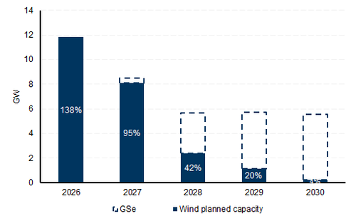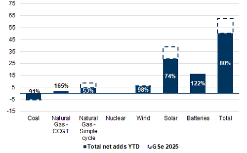 By technology, wind capacity additions and coal retirements were roughly in-line with our expectations in 2025, while storage and CCGT surpassed our estimates at 122% and 165% of GSe. The main laggards were simple cycle gas and solar additions, reaching only 53% and 74% of GSe in 2025, respectively, even though nominally, solar capacity adds were strong at 29 GW making up for 57% of total yearly additions.