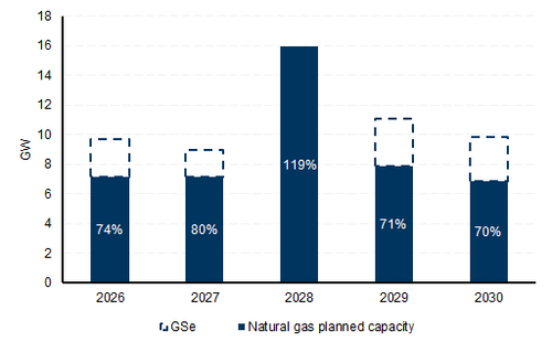Projects currently on the pipeline (including under construction and pending approval) represent 109% and 107% of our expected net adds for solar capacity in 2026 and 2027, respectively, and 138% and 95% for wind. However, planned projects in the pipeline for renewables drop significantly in the 2028-2030 time frame, which could be a function of the timeline or the sunsetting of tax credits. Projects under planning status for natural gas continue to be heavily concentrated in the 2028 delivery time frame, with pipeline projects for 2028 representing 119% of our gas capacity net additions estimates for that year. Notably, planned natural gas projects for the year of 2030 increased significantly (see Exhibit 8), jumping from ~3 GW planned to ~7 GW planned for that year in the December data release. We would note that, according to the EIA, the data on project updates is self reported by the companies and, therefore, susceptible to some subjectivity on the reporting timeline of the projects.
