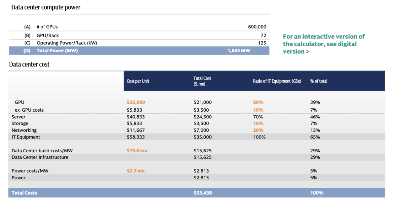 To provide a high level framework on how to think about the related spend for a project, we reference our GS Data Center Project Cost Calculator / Framework, introduced in our January 2026 IT hardware initiation. While we recognize that there can be a wide variety of XPU costs, energy performance, and adjacent networking requirements, we believe this tool to be a helpful framework to think about what goes into a data center project. For example, our calculator estimates that building out 1 GW worth of capacity of $35,000 H100s would cost approximately $54 bn in total when including all systems, power, and build costs. This estimate is largely in line with OpenAI’s previous comments that it costs ~$50 bn to bring 1GW of capacity online.